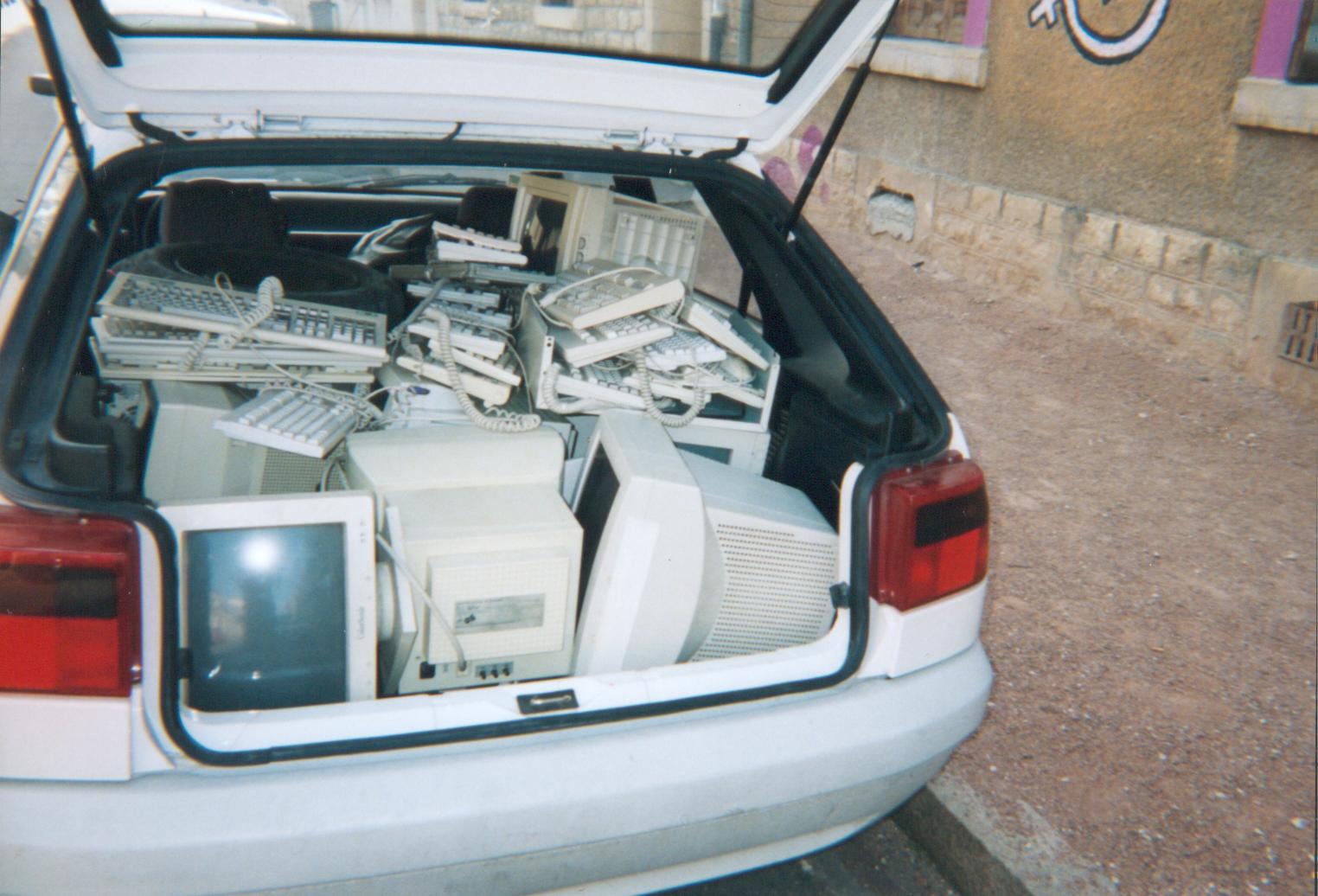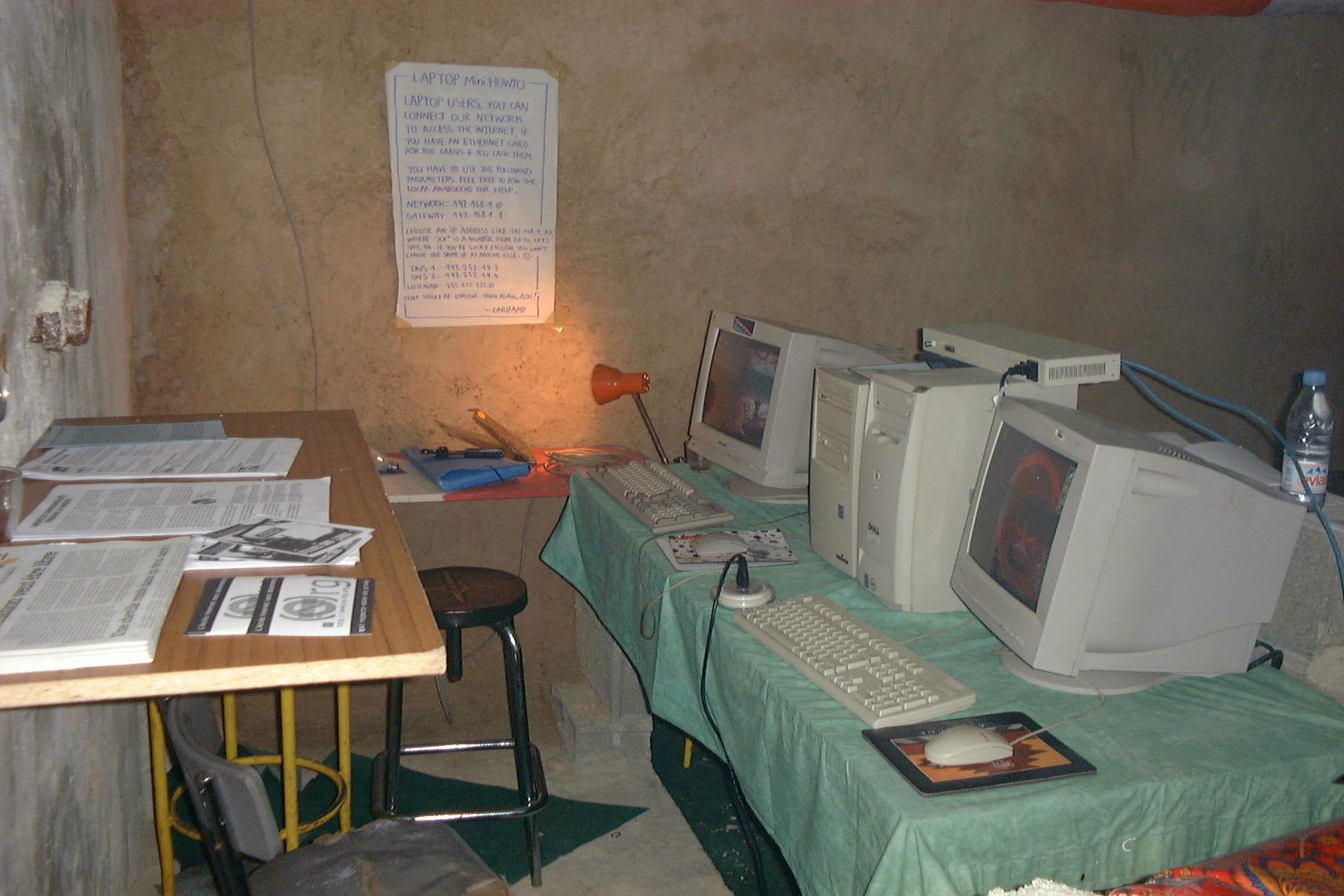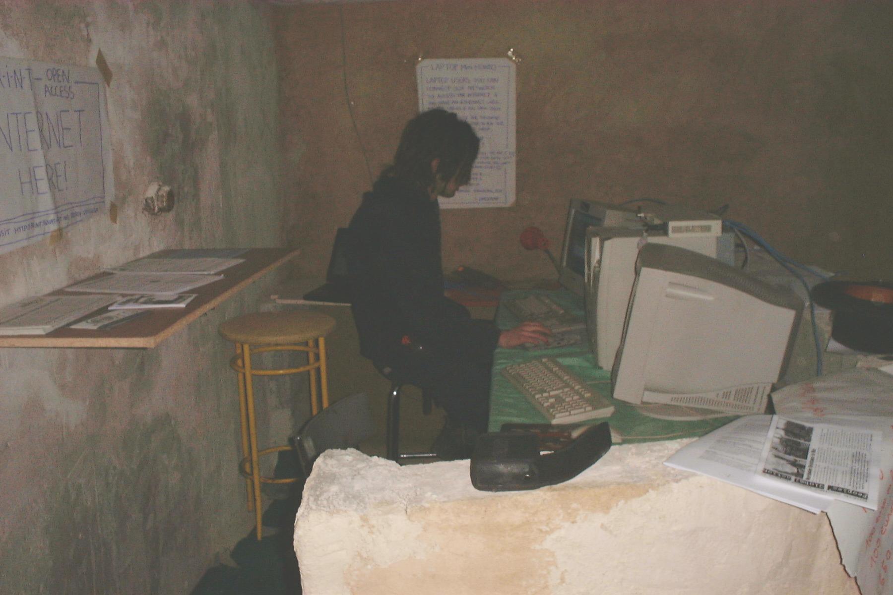 Installation d'un "mini open-access" et "laptop point" à l'occasion d'une réunion d'hiver 2003 de l'Action Mondiale des Peuples aux Tanneries.